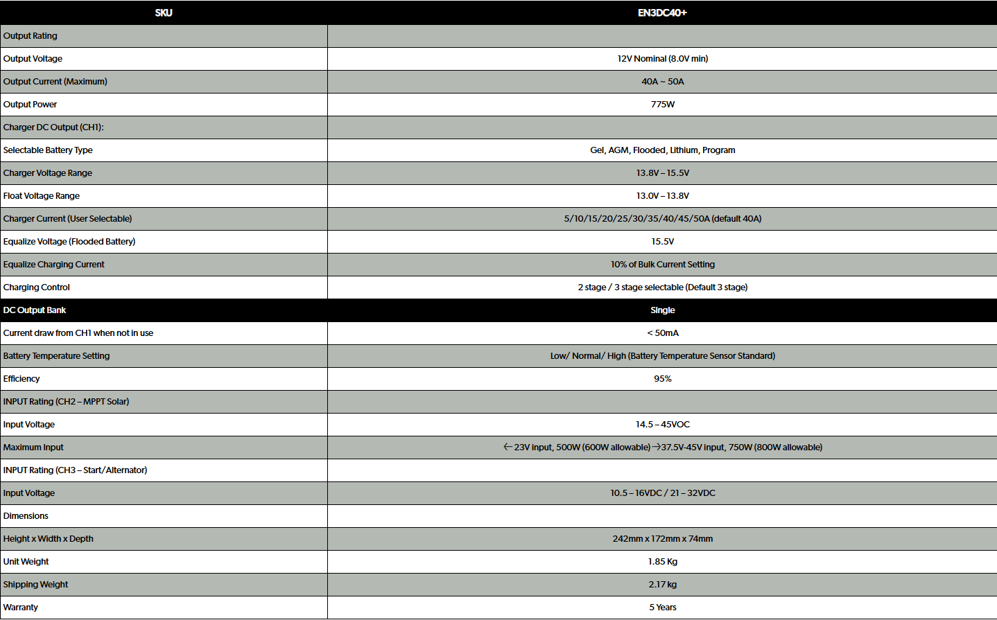 The Enerdrive | Dometic DC2DC 40A+ (up to 50A*) Battery Charger is a fully automatic multistage, multi input battery charger with the ability to charge from either an alternator linked to a battery; or via solar power with the in built Maximum Power Point Tracking (MPPT) Solar Controller. With two inputs available, the main/house battery will be charged from either the engine while underway, or via the solar panels when stationary. The process to choose either engine or solar is fully automatic and both functions are controlled from within the unit itself without the need for external relays.